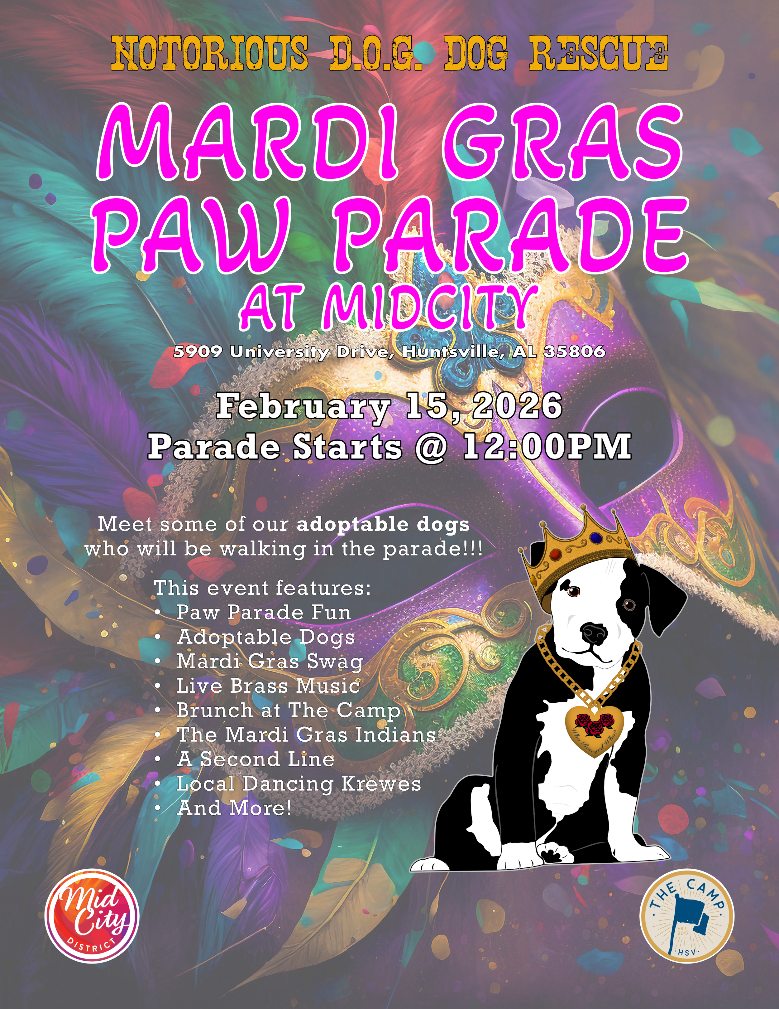 Come immerse yourself in the culture of New Orleans and support us as we walk with some of our adoptable pups in The Camp’s Mardi Gras Paw Parade!