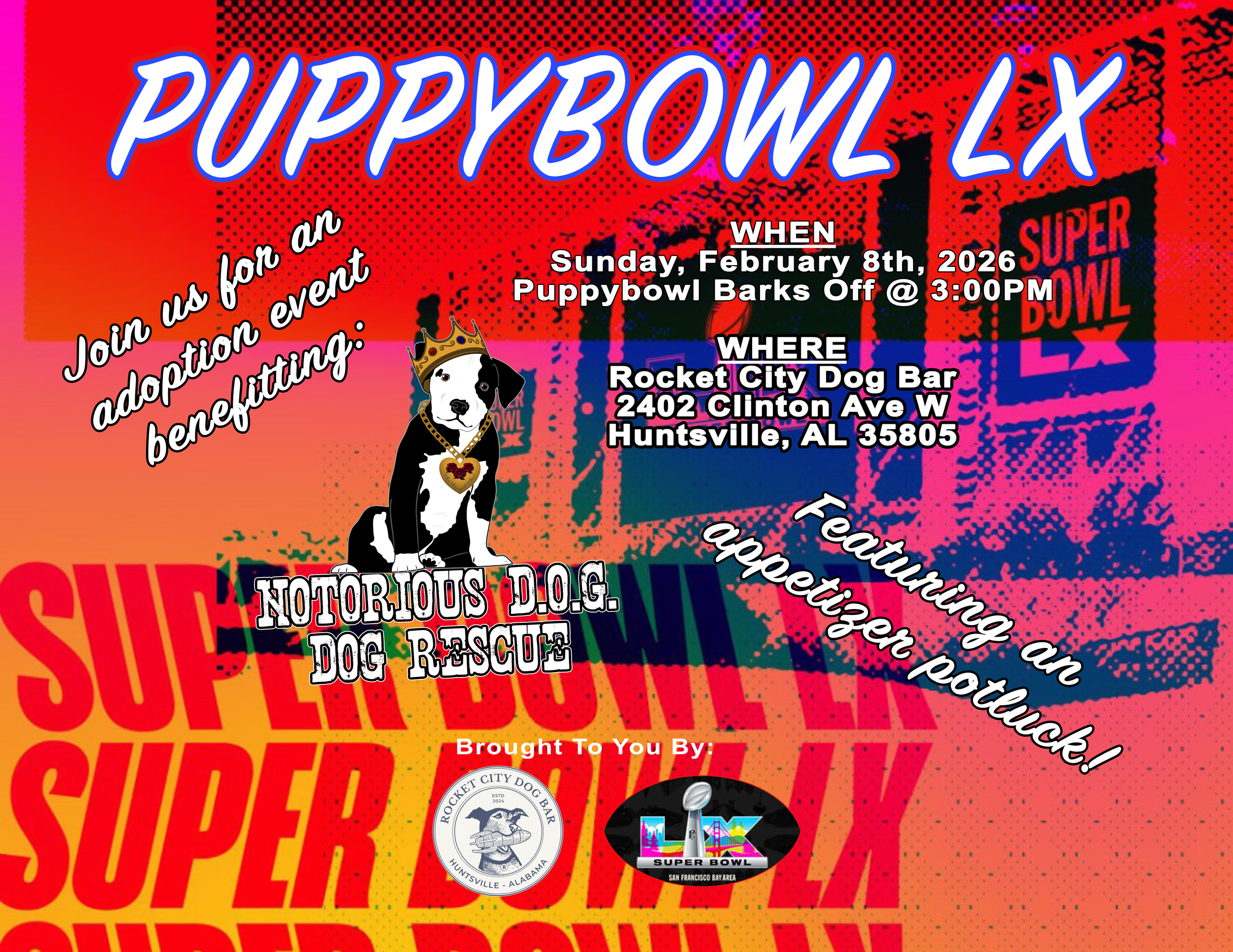 Join us at Rocket City Dog Bar on Super Bowl Sunday at 3 PM for this year’s Puppybowl LX!