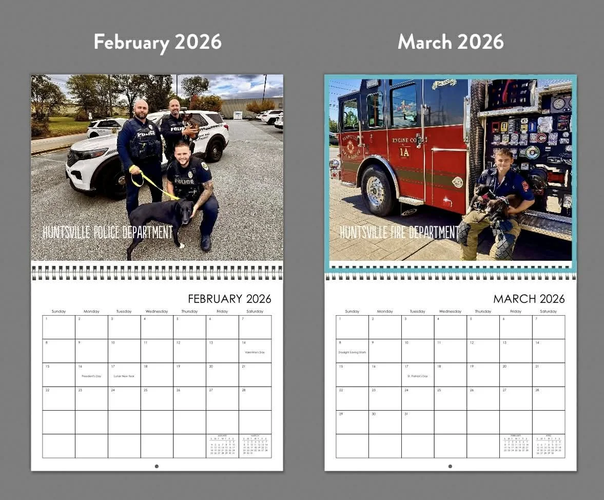 Huntsville is full of heroes and this year our pups got to meet them! Our calendar features our pups with local first responders, volunteers, and small business champions who partner with us.